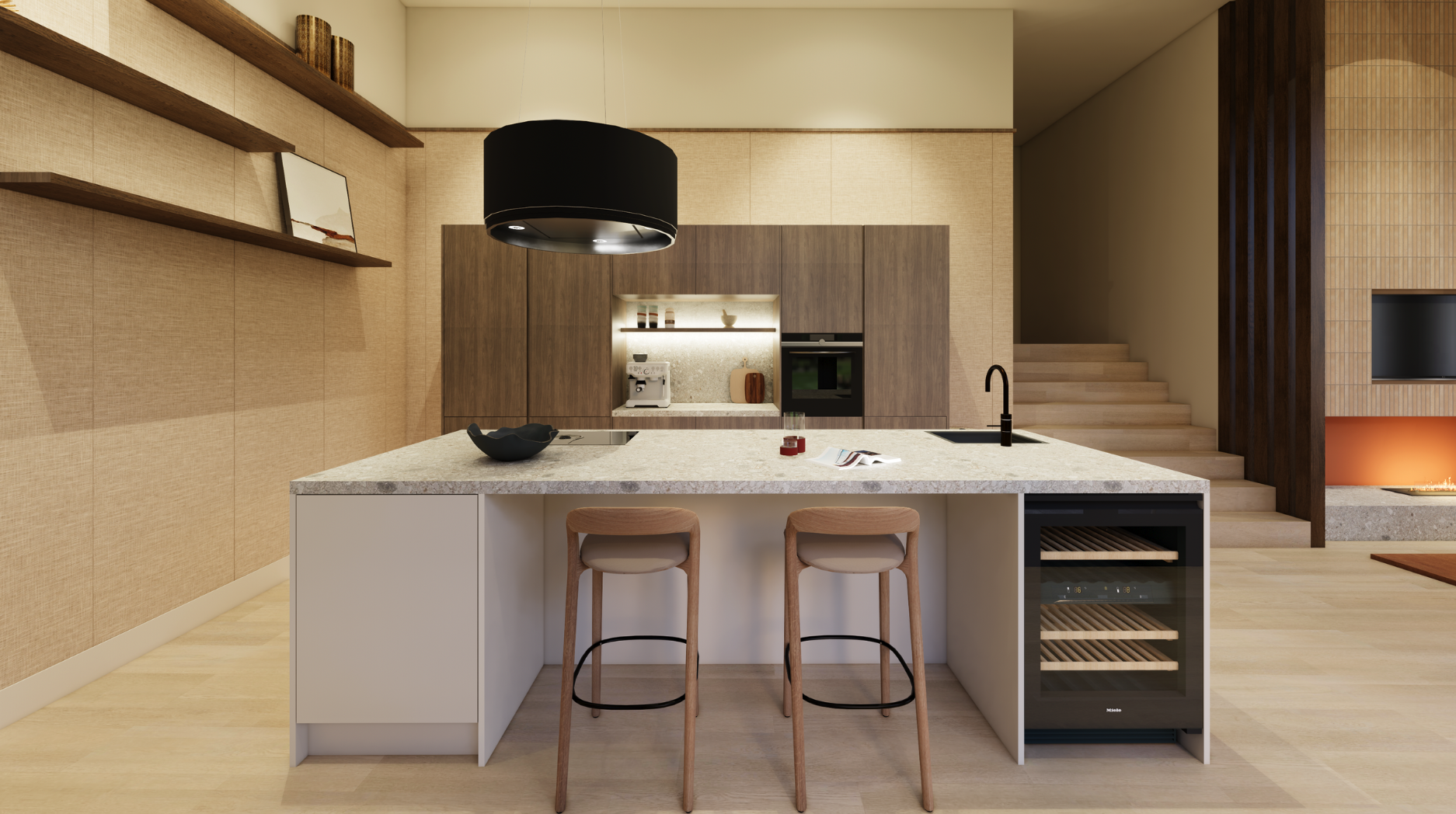 Dit nieuwbouwproject staat gepland voor oplevering in Q4 2025 en wordt midden in een park gebouwd. Om de natuur te omarmen heeft de woning een grote pui en veel ramen van wel 4.20 hoog. Prachtig, maar dit brengt gelijk wel een uitdaging met zich mee; hoe houden we de woning knus met zoveel ramen en een hoog plafond? De bewoners houden van stoere en natuurlijke materialen. Daarnaast hebben zij voor werk een tijd in het Midden Oosten gewoond dus mocht er een vleugje Oosters in naar voren komen. Het is deze mooie combinatie van donker hout, stoere materialen zoals ceppo di gre, structuurbehang en een vleugje terracotta geworden.